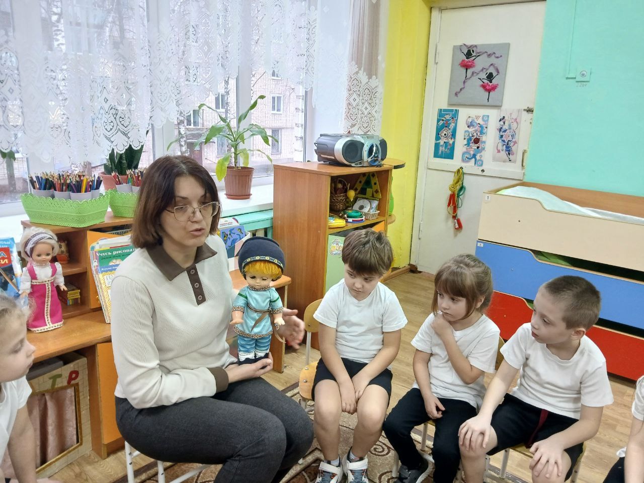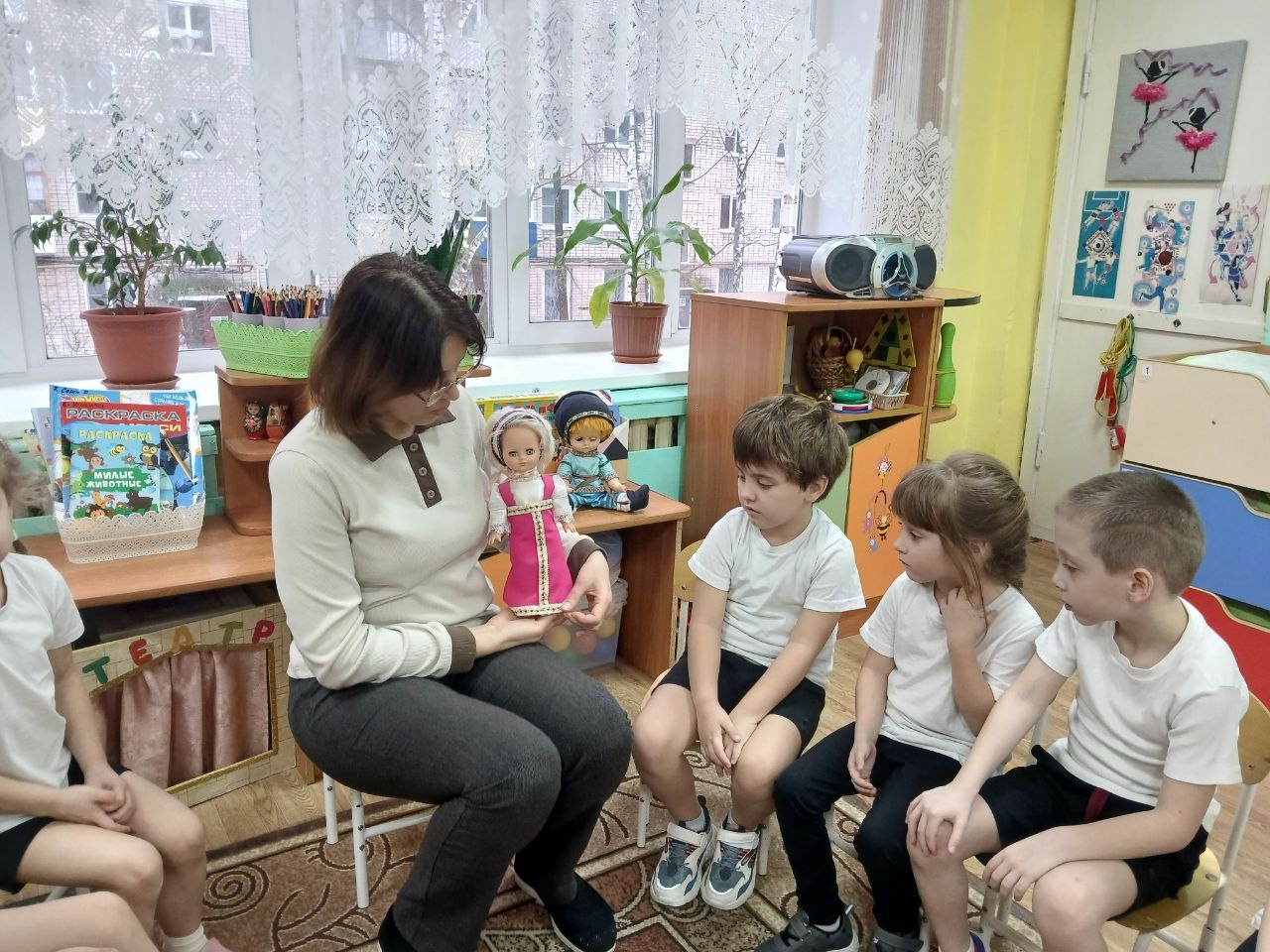 В рамках недели "Родной язык - мое богатство" в старшей группе "Бабочки" прошло занятие "Русский народный костюм - хранитель истории". В гости к детям пришли Иван и Марья в русских народных костюмах. Они познакомили детей с одеждой наших предков (что носили люди повседневно, в праздничные дни и когда работали). Ребятам объяснили, что название одежды отличается от названия одежды нашего времени.Так же дети познакомились с народной игрушкой и смогли её расписать.