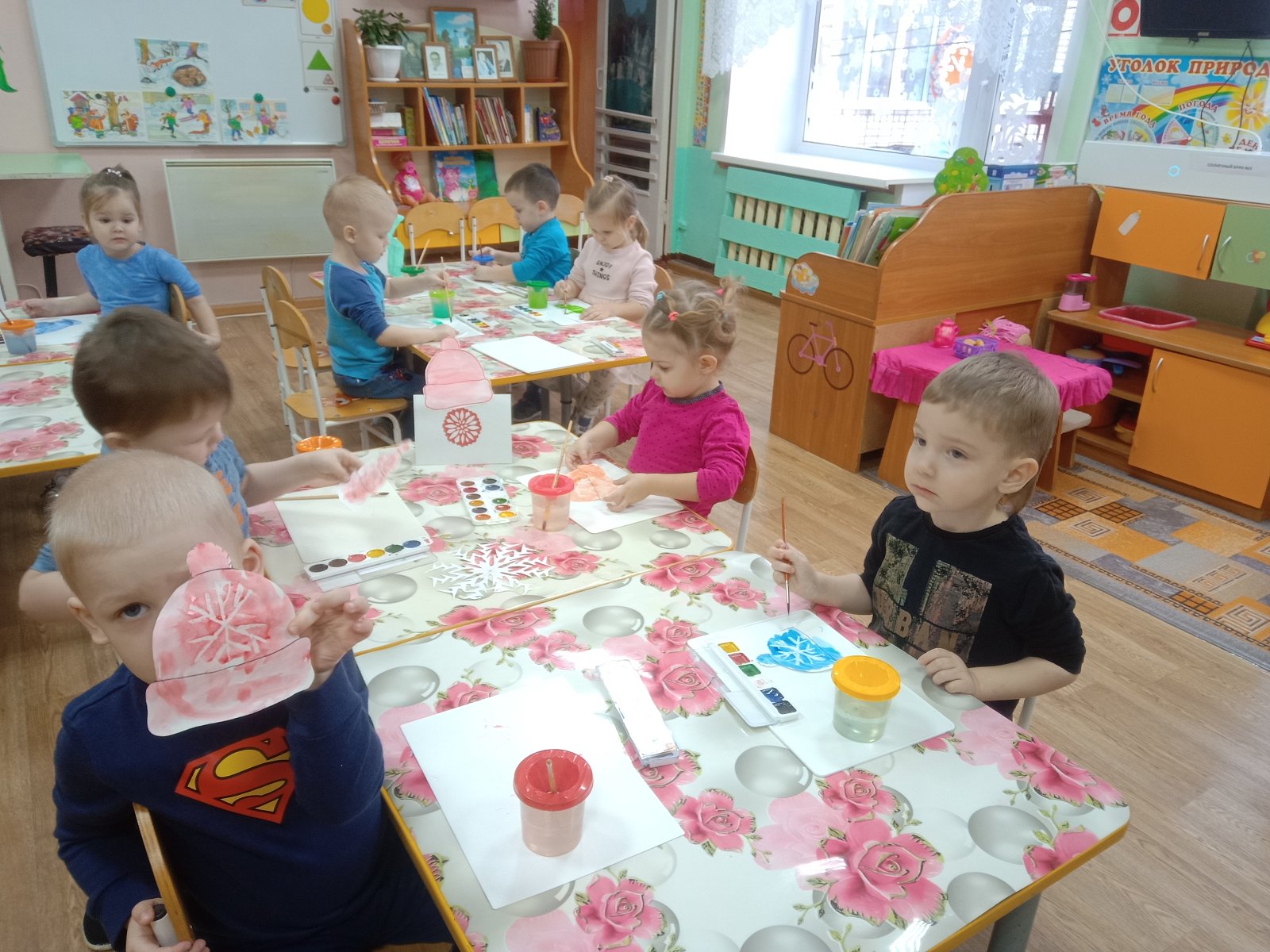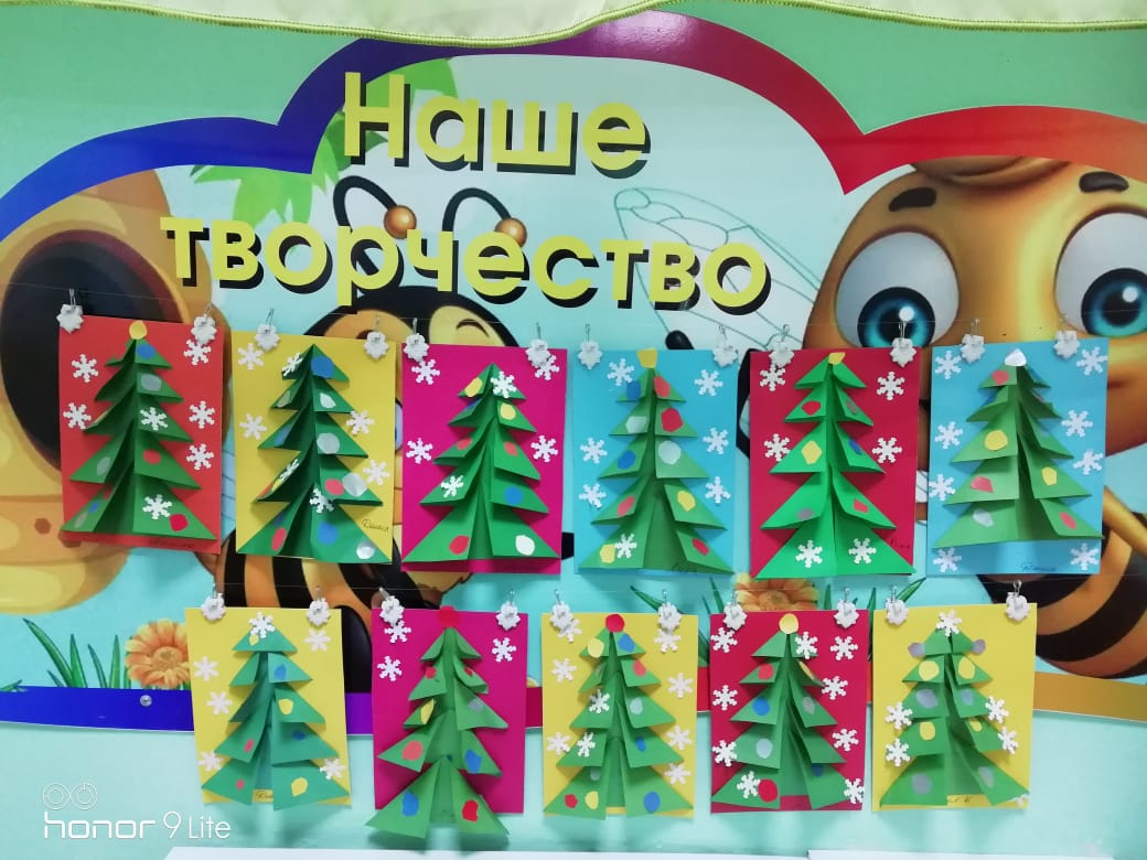 В рамках тематической недели "Новый год у ворот" дети второй младшей группы "Бабочка" нарисовали снежинки, а воспитанники подготовительной группы №3 "Пчелки" конструировали из бумаги елочки.